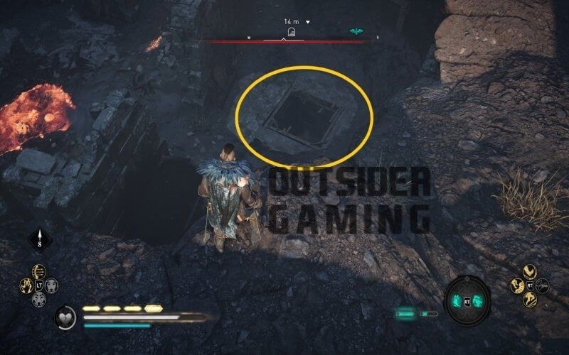 前哨基地を流れる溶岩の流れには金属製の檻があり、胸は檻の中にありますが、入り口は大きな可動石で塞がれています。