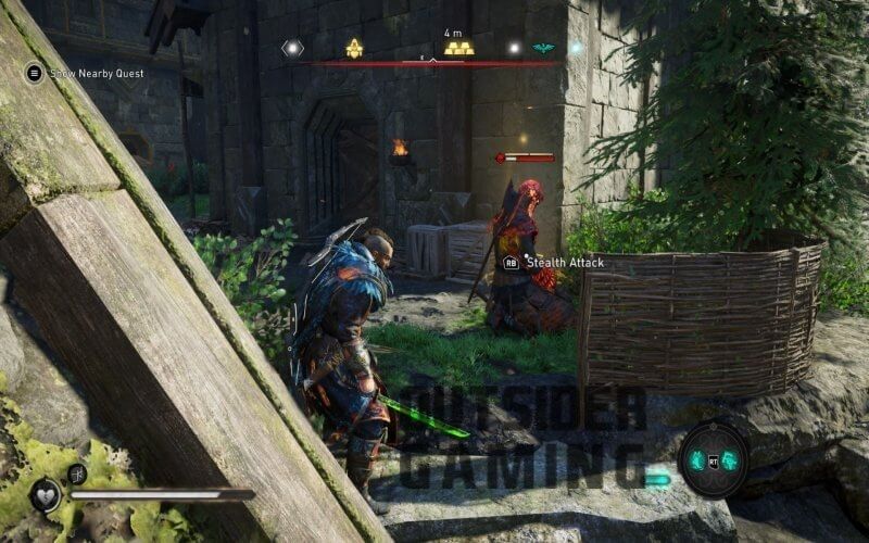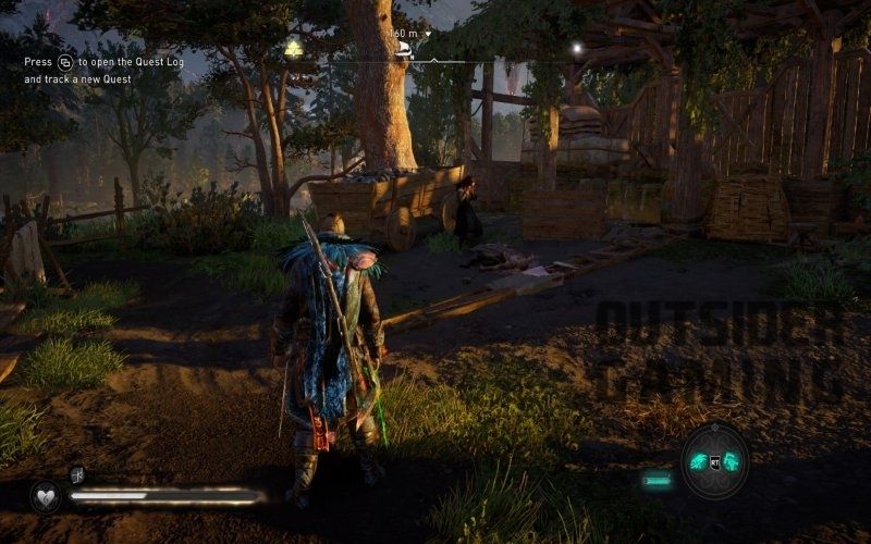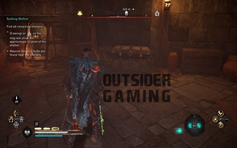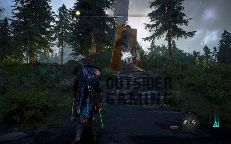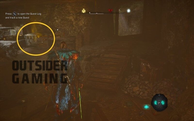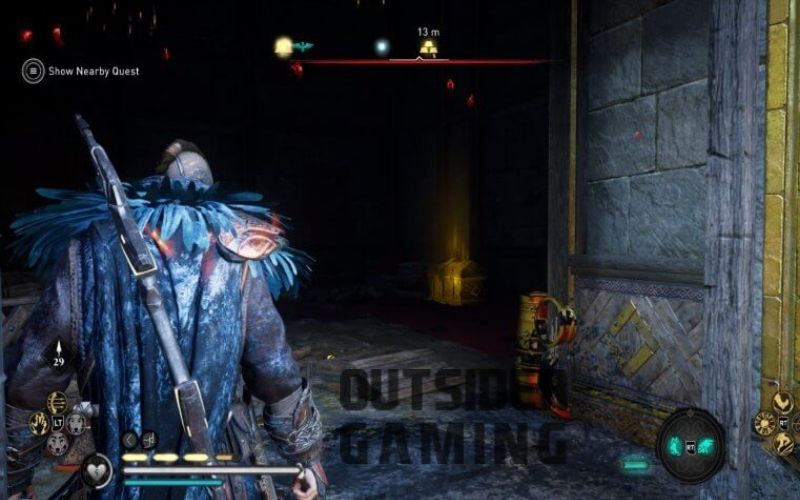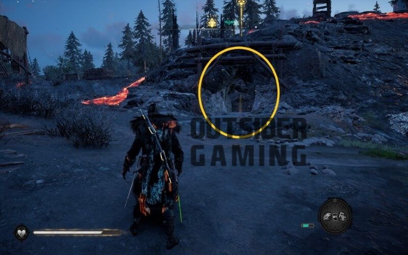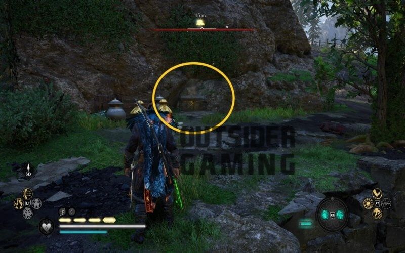 Odin’s Sightを使用して、前哨基地の南側にある岩壁に対して壊れやすい木製の障壁の後ろに座っている胸を見つけます。