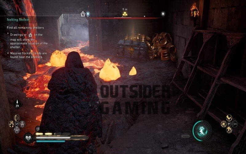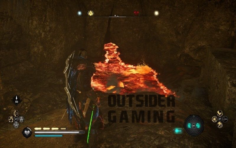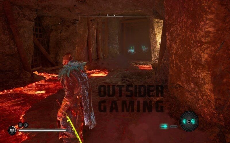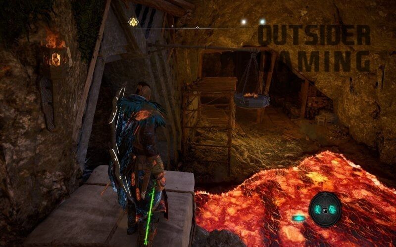 廊下の終わりに到達したら、溶岩を越えて洞窟の右側に到達する必要があります。 左側の階段を上って、ぶら下がっているブレイザーを使って反対側のプラットフォームにたどり着くことができます。