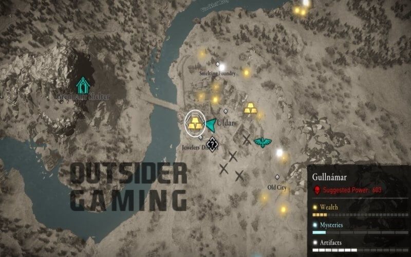 ウェルスピースは、近づくにつれてウェルスのタイプを明らかにする前に、マップ上に金色の点として表示されます。 グルナマール全体の視点を探索して同期すると、富の断片に遭遇します。 この地域には、プラチナインゴット、ギア、知識の本、シリカの4種類の富が収集されます。