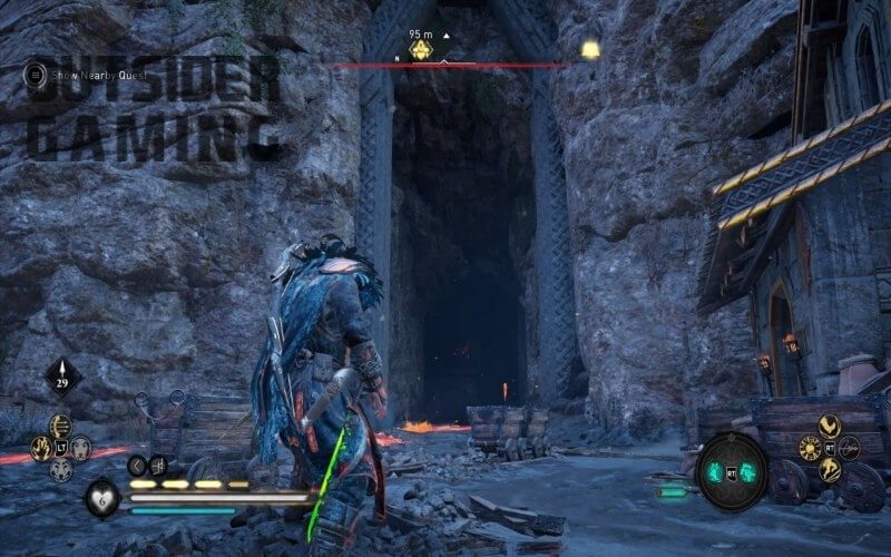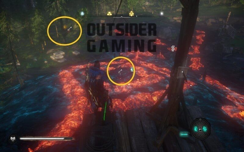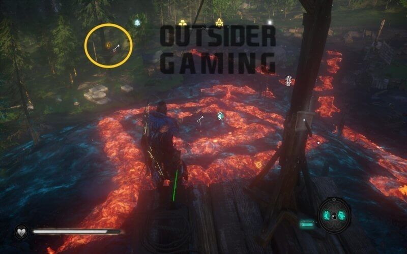 村の視点に移動し、オーディンの光景を使用して、溶岩で覆われたエリアの中心を見下ろします。 そこに鍵があり、さらに東の丘を下ると、ジップワイヤーの下部近くの左側にある木のプラットフォームにもう1つ鍵があります。