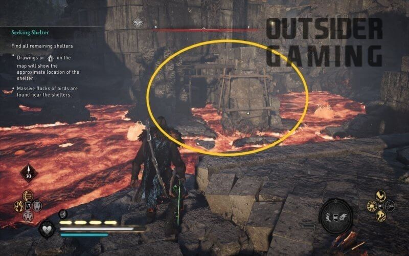 左側の小道をたどると、壁の割れ目から溶岩が流れているのがわかります。 Hugrがない場合は、壁に向かってYggdrasilShrineを使用して補充します。