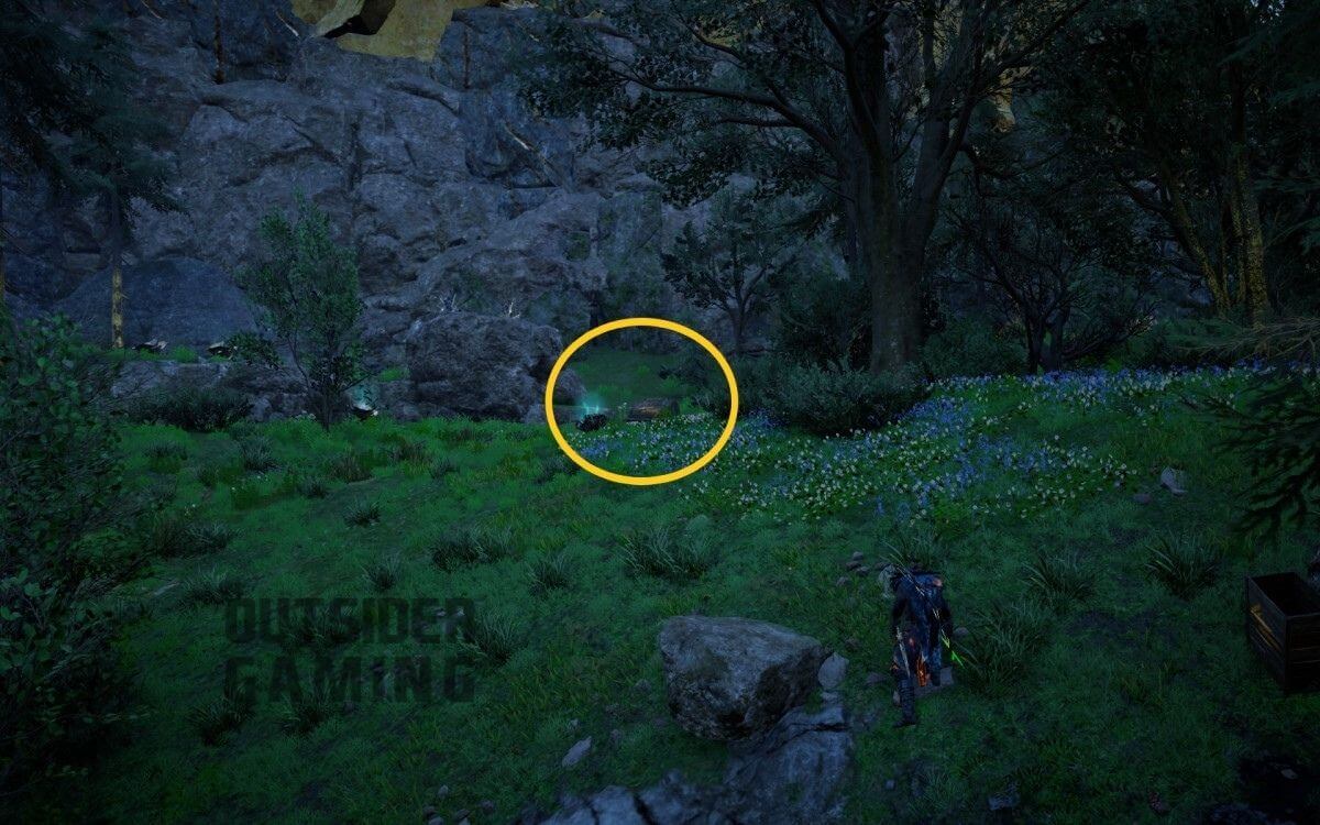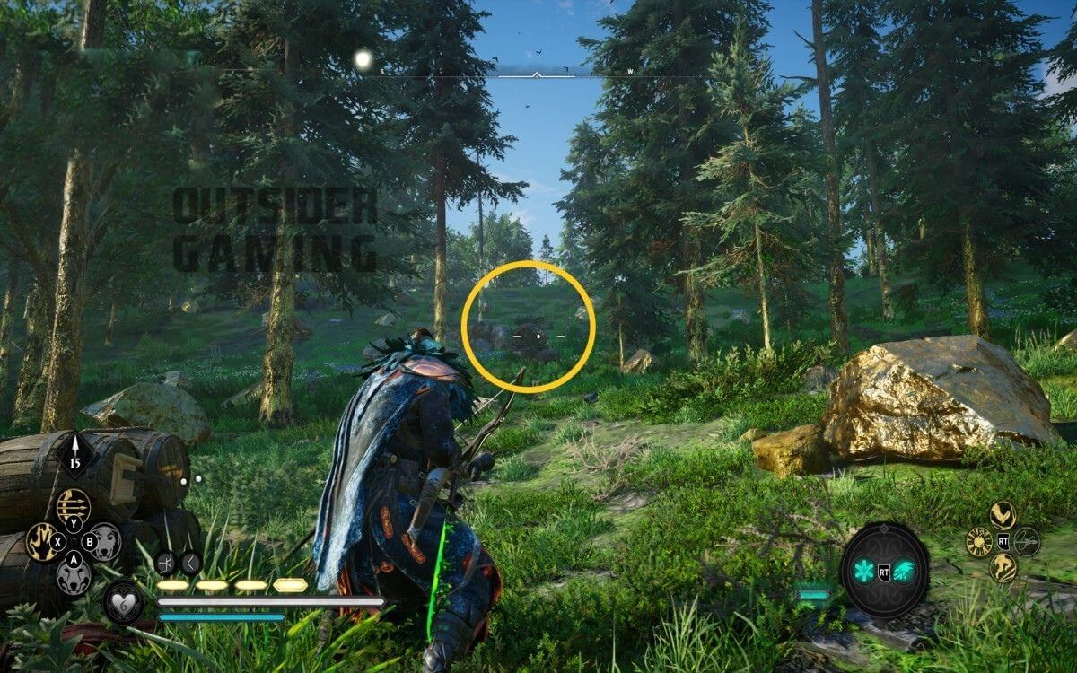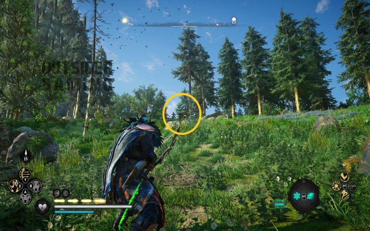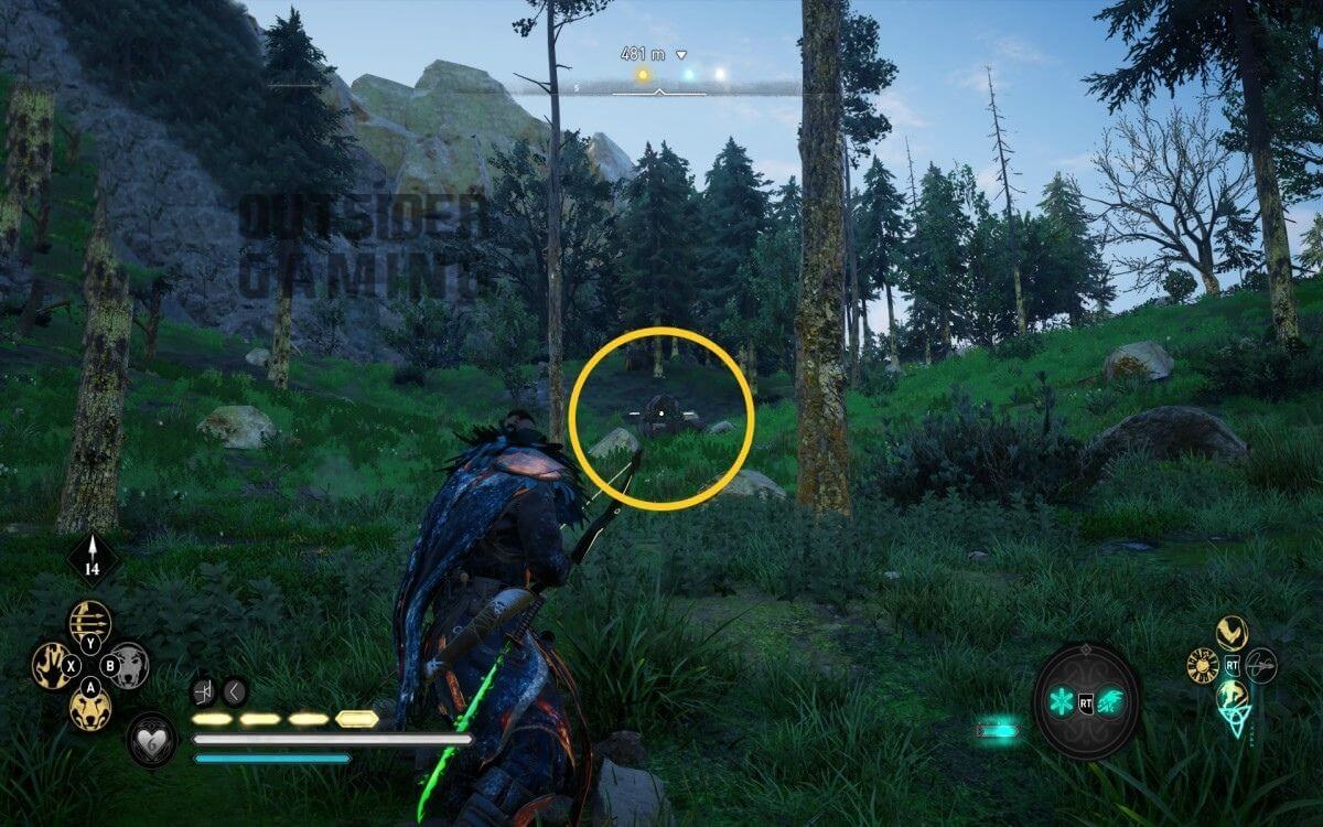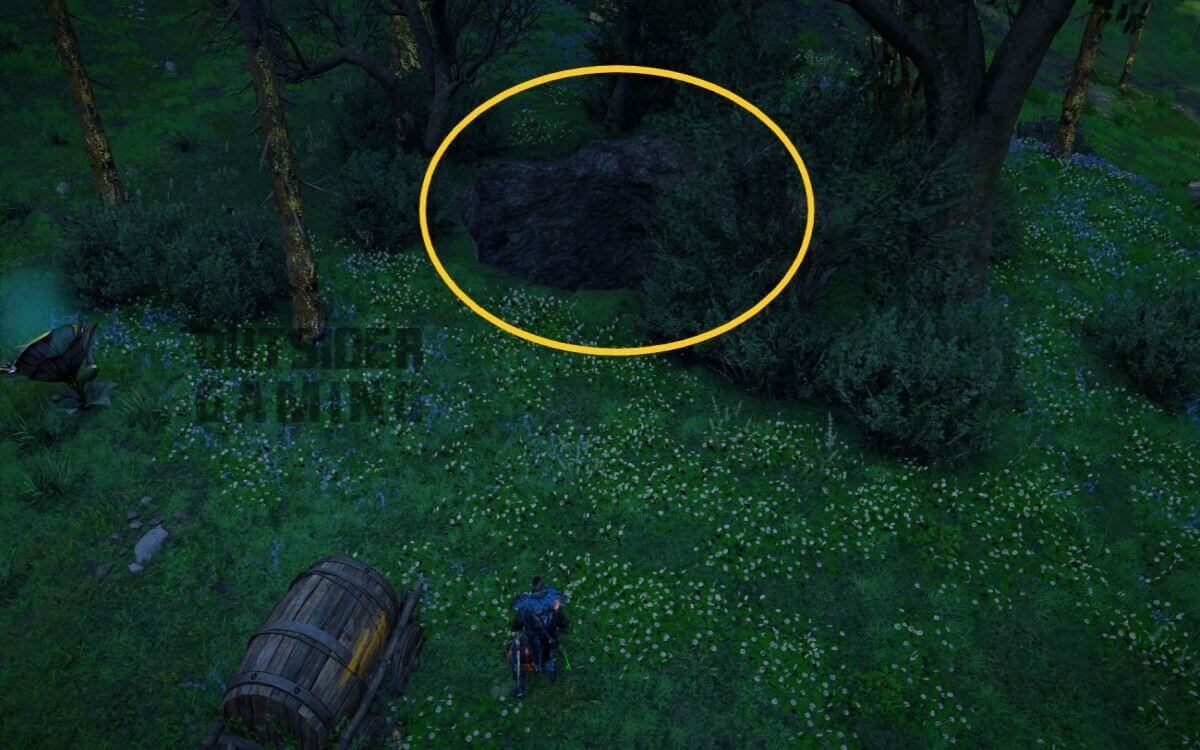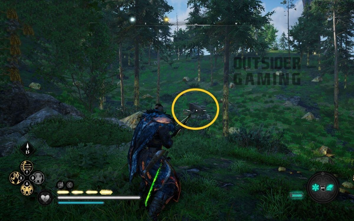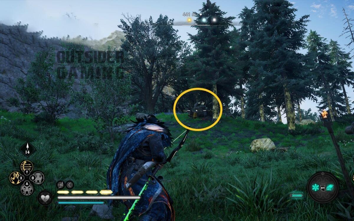 上の画像に見られるように、次の手がかりは丘の少し上にある木の下に座っています。 今回は、周りに金色の装飾が施された岩の横にある小さな木箱に描かれています。 ここから、それが示す方向に正確に進みます。丘を少し上ると、木々や茂みに囲まれ、地面に大きな穴が開いています。