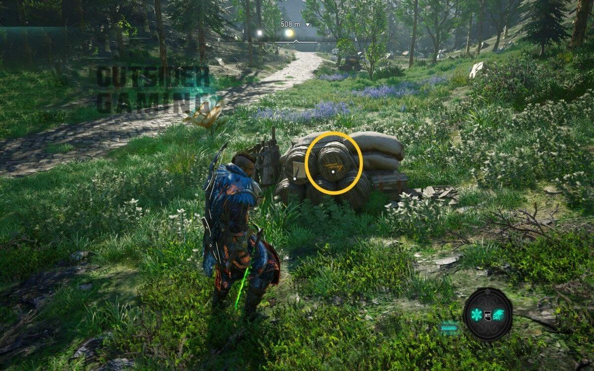 ここから、マーカーが示す方向に移動します。 丘の真上には、カートの上にある巨大な樽があり、画像に示すように、最初のマーカーから見える側面に別のマーカーが描かれています。