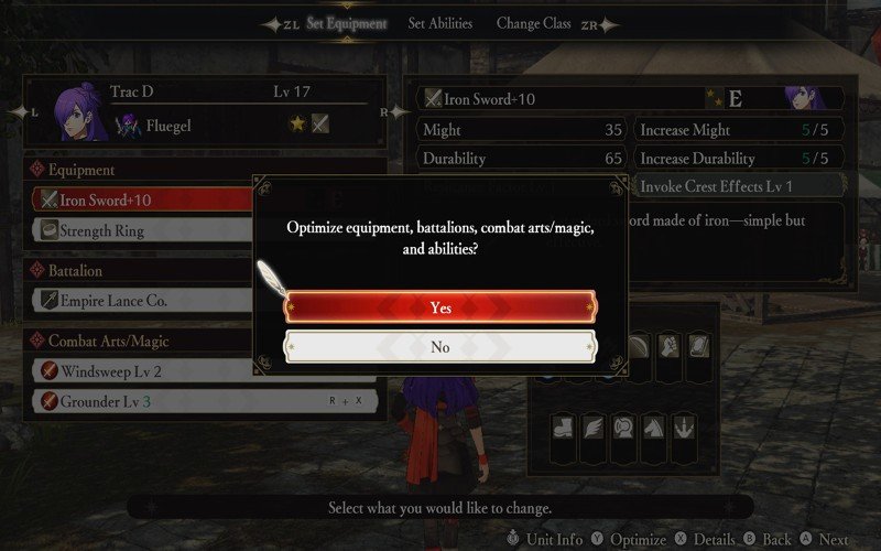 最適化機能は、ユニットに最適な装備、大隊、戦闘芸術、魔法、能力を自動的に選択します。 現在所有している機器、スキル、アイテム、および選択したクラスに最適なものに基づいて、さまざまなバリエーションとオプションを選択できます。