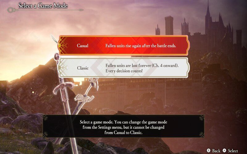 カジュアルモードでは、戦闘後に再び上昇しますが、クラシックモードでは、第4章に到達すると、ユニットは復活しません。いつでも簡単から難しい難易度に変更できますが、 カジュアルモードまたはクラシックモードを選択すると、それを変更することはできません 新しいゲームを完全に開始することなく。
