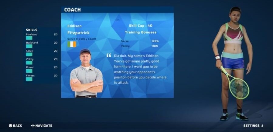 最初はアイルランドのエディソン・フィッツパトリック監督です。彼はあなたがキャリアを始めるとロックが解除されます。 フィッツパトリックは、サーブとボレーの属性のトレーニングにボーナスを与えます。 彼はサーブに120%のボーナスを与え、ボレーに110%のボーナスを与えます。