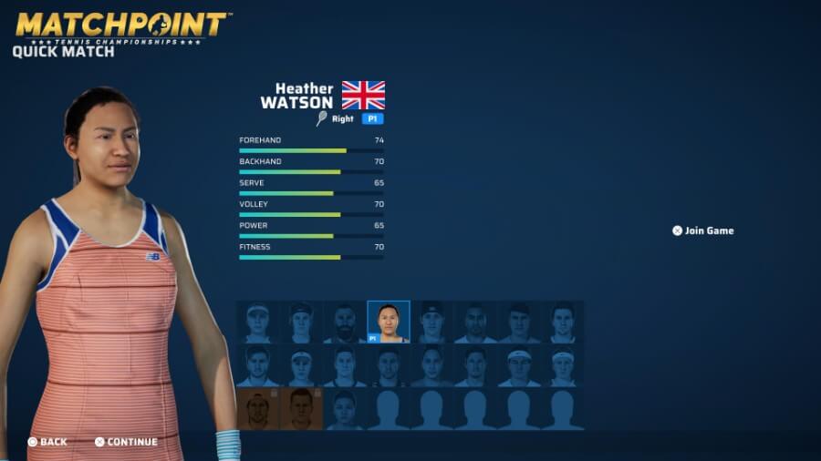 マッチポイント–テニス選手権の5人の女性選手のリストがあります。 幸いなことに、5つあれば、ゲームのようにプレイして誰が好きかを見つけるのにそれほど時間はかかりません。 キャリアモードでさらに数人の女性プレイヤーを作成し、それらを構築して、さらにプレイ可能なキャラクターのリストに追加してください!