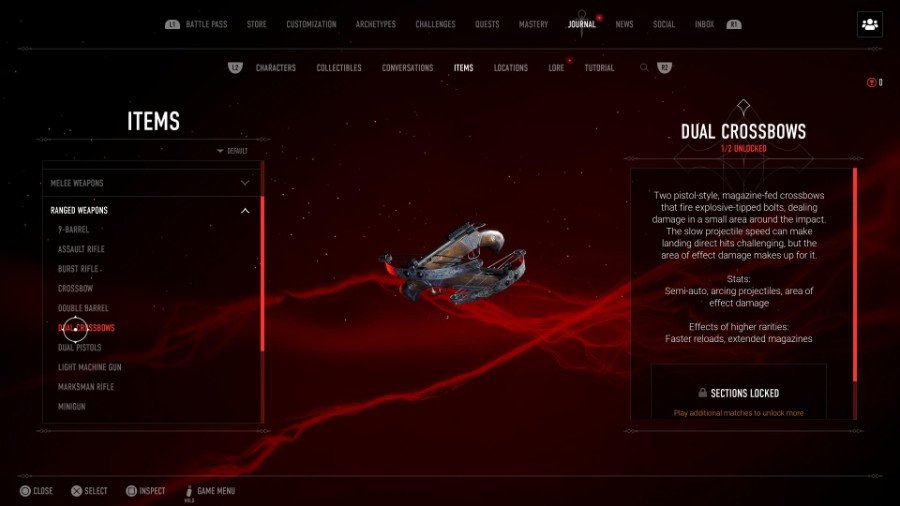興味深い武器であるデュアルクロスボウは、標準のクロスボウとは異なる機能を持っています。 標準では、敵を盲目にし、敵にわずかなダメージを与える有毒ガスを含むボルトを解放します。 代わりに、デュアルクロスボウにはボルトがあります 爆発するボルトで効果範囲があります。 発射速度が遅く、ボルトの速度が遅いため、連射には理想的ではありません。 ただし、その効果範囲は、実際に敵を攻撃することなく敵にダメージを与えることができることを意味します。 ボルトを覚えておいてください アーチ型の軌道をたどる。 レア度が高くなると、デュアルクロスボウはより速いリロードと拡張マガジンを受け取ります。 屋上からデュアルクロスボウを使用するのが最善かもしれません。
