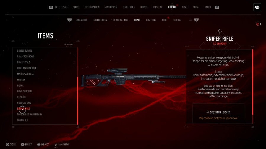 スナイパーライフルは、ステルスで長距離の狩猟を好む人におそらく最適です。 これは、2つのNosferatuアーキタイプのいずれか、特に プラウラーとその原型能力、スカウティングファムルス。 予想通り、スナイパーライフルは非常に長距離で非常に効果的です。 これは、銃だけでなく、ゲーム内で精度を高めることができる数少ないゲームの1つです。 スナイパーライフル 精密な弾薬が必要。 それは半自動です ヘッドショットダメージを増加させる。 より高いレア度では、スナイパーライフルはより速いリロード、より良い反動回復、増加したマガジン、そしてより長い射程を獲得します。 ただし、スナイパーライフルだけで近距離で捕まることに注意してください。 常に二次銃を手元に置いてください!