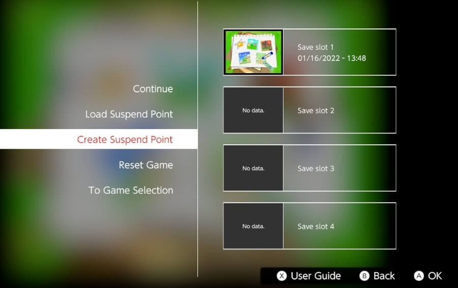 カービィ64には従来の保存オプションがないため、 4つのサスペンドポイントスロットを活用してください。 サスペンドポイントを作成するには、–(マイナスまたはダッシュまたはハイフン)を押して、写真の画面を表示します。 いつでも保存するために使用できる4つのスロット(拡張パスのゲームごと)があります。 これにより、ゲーム内のメカニズムに頼るのではなく、サスペンドポイントをすばやくロードし、中断したところから文字通り再開することができます。