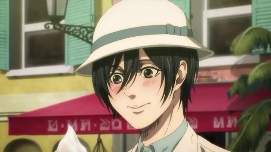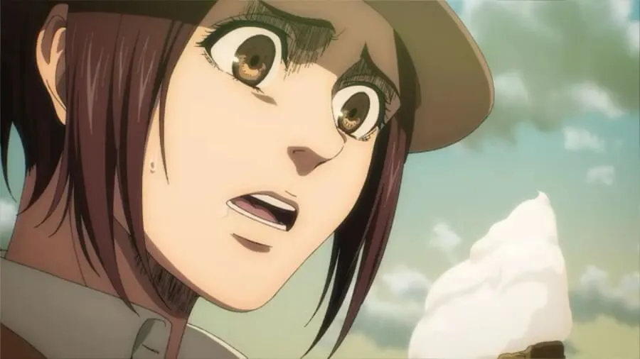 サーシャは、まるで聖遺物を持っているかのように、畏敬の念を持ってアイスクリームを購入しているところが示されています。 彼女はいくつかを試み、その冷たさに反応し、そしてコニーはいくつかを試みます。 突然、2人とJeanは、ベンダーが初めてアイスクリームを試して笑ったので、みんなにアイスクリームを食べるように言っています。 ハンジは、彼らが「その島の「悪魔」」だとは誰も思わないだろうと言います。