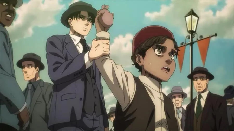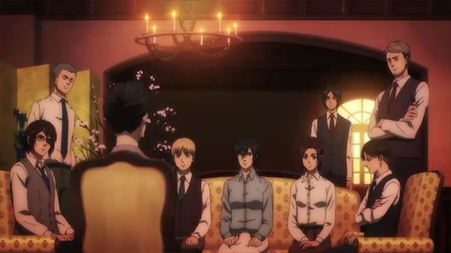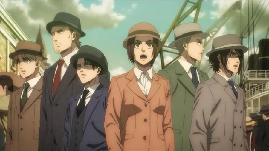 コニー、ジャン、サーシャが船の甲板にいて、壁の向こうの世界に驚いたときのフラッシュバックが表示されます。 ジャンはコニーに壁についてそんなに大声で話さないように言います、しかしサーシャは誇らしげにジャンの悔しさに彼らのアイデンティティを宣言します。 彼女が調査を開始すると言っているように、ハンジはレヴィとアルミンの側に示されています。 タイトル画面が表示されているように、それらはすべて豪華なライナーのように見えるものにふさわしい服を着ています。