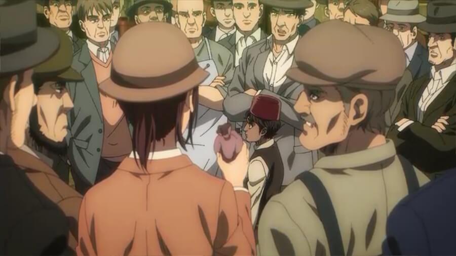 彼らは集会に出席し、そこで男は世界中のイミールの主題のために援助を求めました。 彼は、彼らはエルディアン帝国の「致命的なイデオロギー」とは関係がなく、彼らの憎しみはパラディス島に向けられるべきだと主張している。 彼は「島の悪魔」を真の敵と呼び、群衆から丸い拍手喝采を受けます。