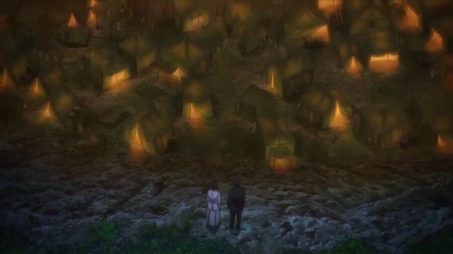 突然、ミカサはエレンがいなくなったことに気づきます。 エレンは夜、丘の上に立って、先ほどの少年が家族に駆け寄るのを見守っています。 敵の狙いで叱る三笠は、目から涙をぬぐうことに気づく。 彼らは、戦争によって人生が混乱した後、人々が生き残るために集まった巨大な難民キャンプに相当するものを見下ろしています。 エレンは、これらの人々は彼らの自由を奪われていると言います。