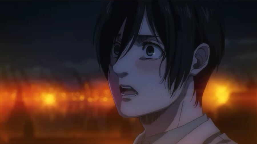 エレンの質問に反応してショックを受けたミカサ(画像出典:MAPPA株式会社)。