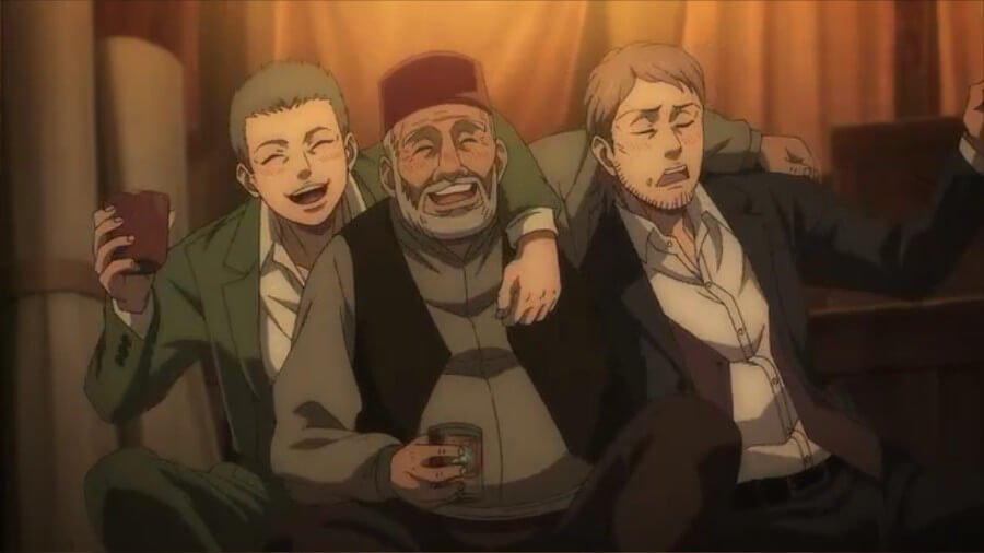 それから彼はミカサの方を向いて、なぜ彼女が彼をそんなに気にかけているのかと彼女に尋ねます。 彼はそれが彼らが子供の頃に彼女の命を救ったからなのか、それとも彼らが家族だからなのかと尋ねます。 彼は率直に「あなたにとって私は何ですか?」と尋ねます。 彼女はどもり、そしてエレンは家族だと言います。 彼らは笑顔の老人が彼らに暖かい飲み物を提供しているのを見て、彼の母国語を使って彼らの中に参加するようになります。 他の人たちはついに彼らにたどり着き、彼らは皆、ごちそうに相当するもののために老人の家族に加わります。