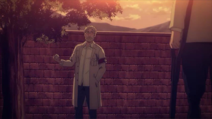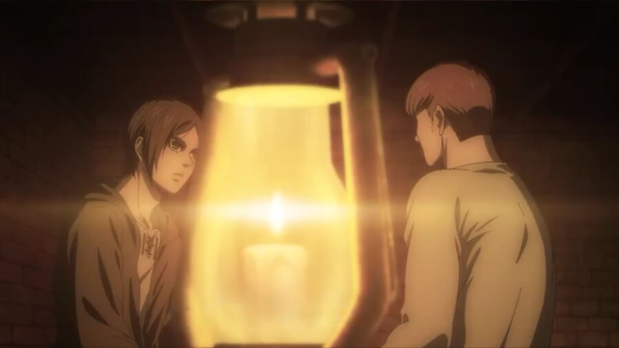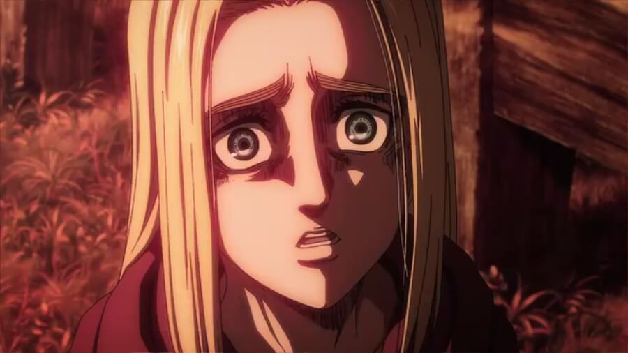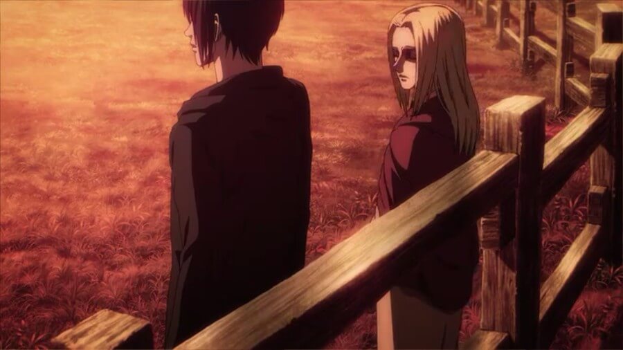 彼が人類と彼の敵を一掃する彼の計画を明らかにするとき、場面はフロックとヒストリアとの彼の議論の間で切りました。 ヒストリアは彼に大きな間違いを犯していると彼に言います、そして壁の外の誰もが彼らの敵であるというわけではありません。 彼女は彼に、ほとんどがエレンの母親、カーラのようになり、理由さえ知らずに死ぬだろうと言います。 エレンは彼女の懸念を認めますが、憎しみから生まれた復讐のサイクルを断ち切る唯一の方法は、「その歴史を、それを生み出した文明とともに完全に埋めること」だと言います。