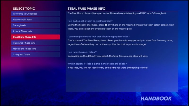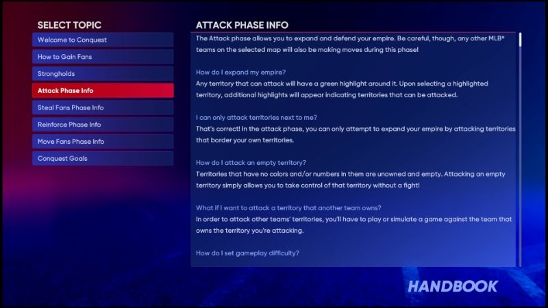 コンクエストは、ダイアモンド王朝のソロゲームモードです。 ファンを獲得し、これらのファンで領土を強化し、領土を征服して各マップを完成させます。 1つの地域で所有できるファンの最大数は9,900万人です。 各テリトリーは、ファンを盗むためのCPUに対する3イニングのゲームを表していますが、拠点を除くすべてのテリトリーをシミュレートできます(以下で詳しく説明します)。 コンクエストモードには、攻撃、盗み、強化、移動の4つのフェーズがあります。