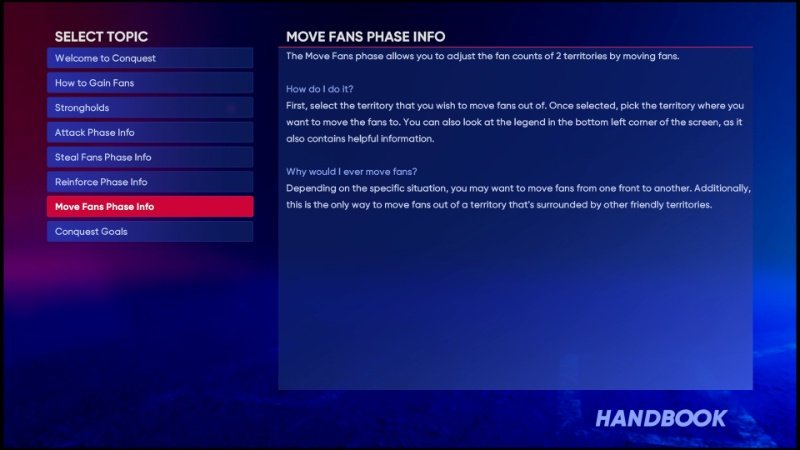 攻撃フェイズとは異なり、ファンを盗むために拠点の領土に隣接している必要はありません。 このフェーズでは、マップ上のどのチームにも挑戦できますが、新しい領土は与えられません。 次のターンに拠点に近づいている、または敗北しようとしているチームをターゲットにすることをお勧めします。