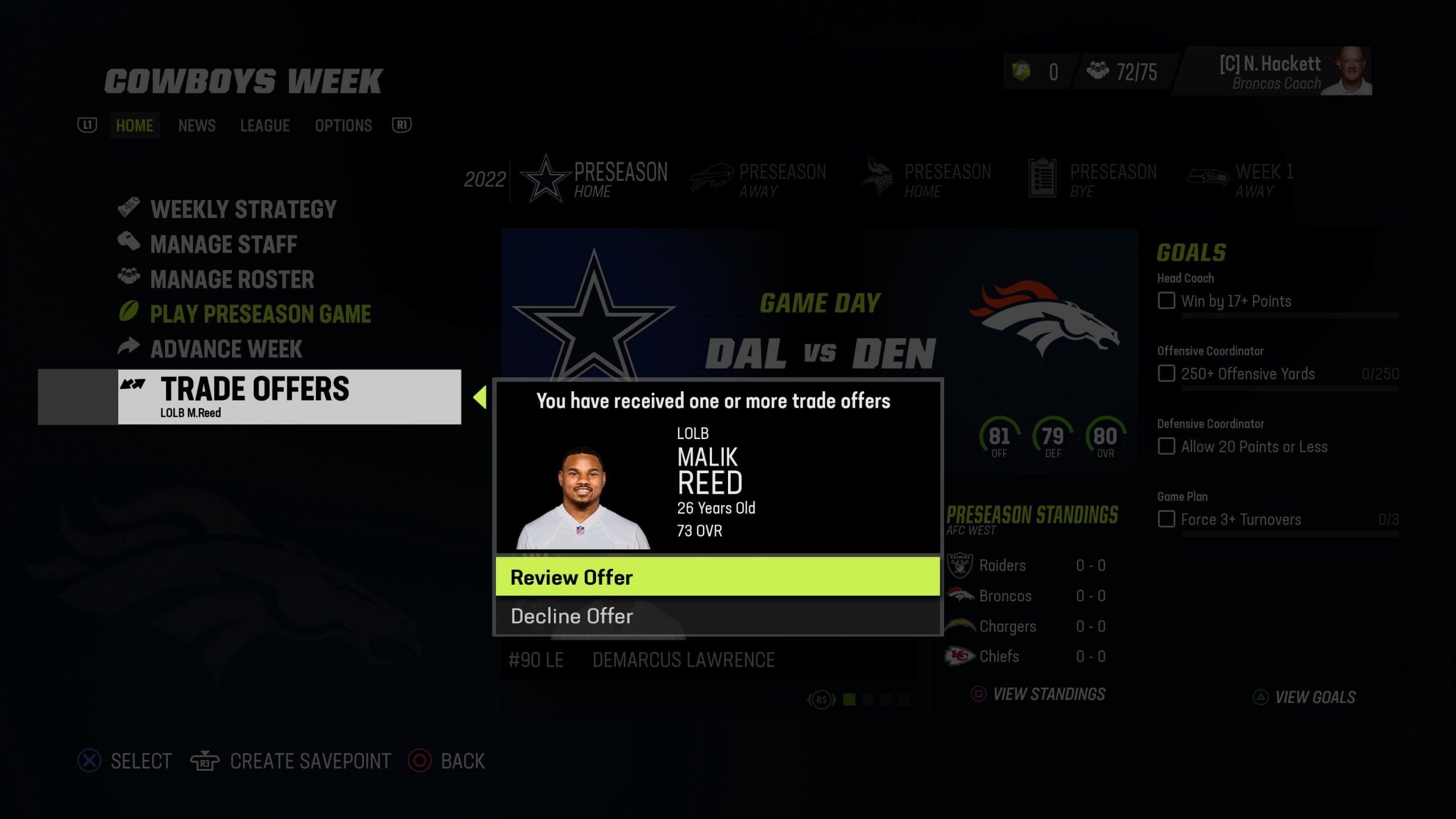 チームがあなたにトレードオファーをした場合、あなたは トレードオファーのメイン画面に通知されます. 上記のダラス戦では、プレシーズンの第 1 週にフランチャイズ モードが開始されるとすぐに、トレード オファーが待っていました。[オファーの確認]をクリックして、チームがその選手に何をオファーしたかを確認します。 たとえば、マリク・リードの場合、6 つのチームが取引を申し出ました。