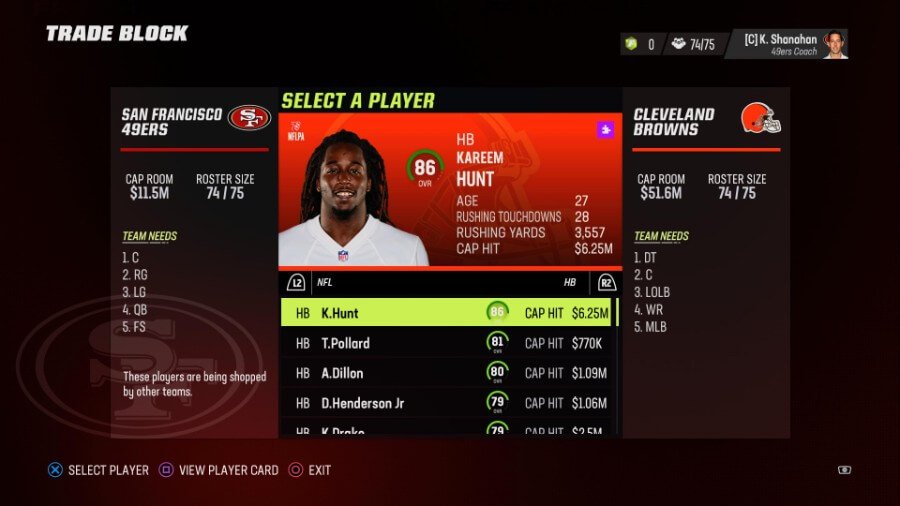 トレード ブロックは、選手を見つけてロスターの深さを埋めるのに最適な場所です。 ハーフバックのカリーム・ハント (OVR 86) のようなスターターがすぐにオファーされることさえあります。 トレード ブロックは、シーズンを通してトレードや怪我が発生すると更新されるため、何か変更があった場合に備えて毎週確認してください。