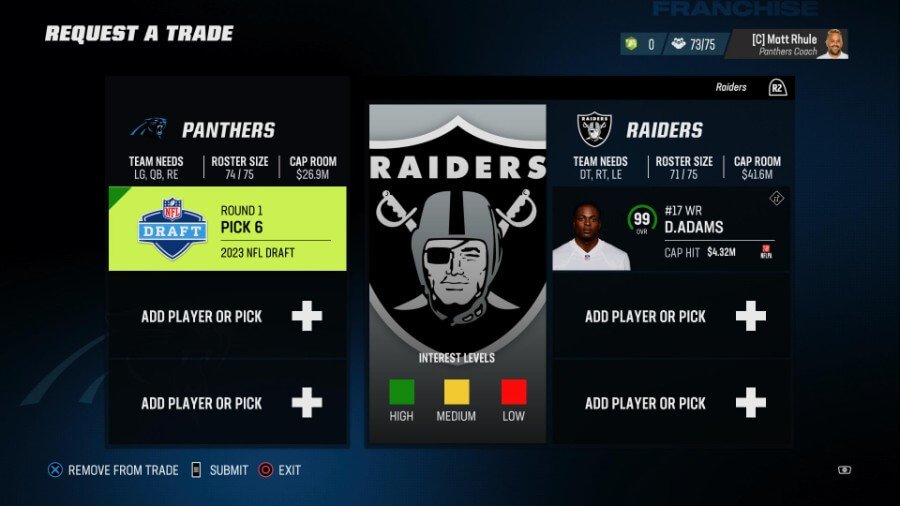 他のチームについては、 約75 OVRのクォーターバックを提供する または、アダムスや他の 99 クラブのメンバーと同様に、 2023年の最初のラウンド. マイアミを使用していて、スターターとして誰が欲しいかわかっている場合は、申し出てください Tua Tagovailoa または Teddy Bridgewater のいずれかをまっすぐに 任意のプレーヤーを獲得します。