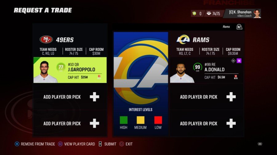 サンフランシスコとして、部門のライバルであるロサンゼルスからドナルドを獲得できます クォーターバックのジミー・ガロポロを提供することによって (77 OVR)。 実はガロポロは 事実上すべてのチームがあらゆるプレーヤーに受け入れられる Madden 23で(クォーターバックの提供については以下をお読みください). サンフランシスコにはすでに優れた防御力がありますが、どのチームもドナルドを追加するチャンスに飛びつき、彼をライバルに向けることができます。彼の前のチームはそれだけ甘いです.