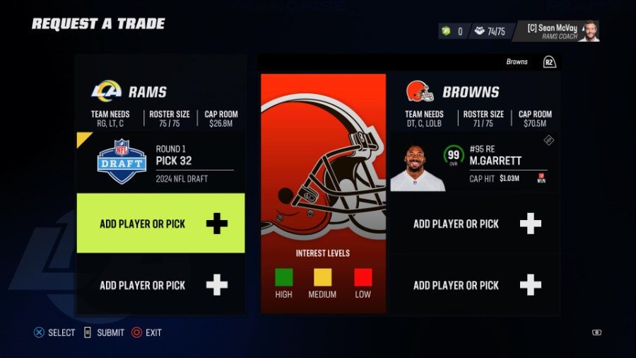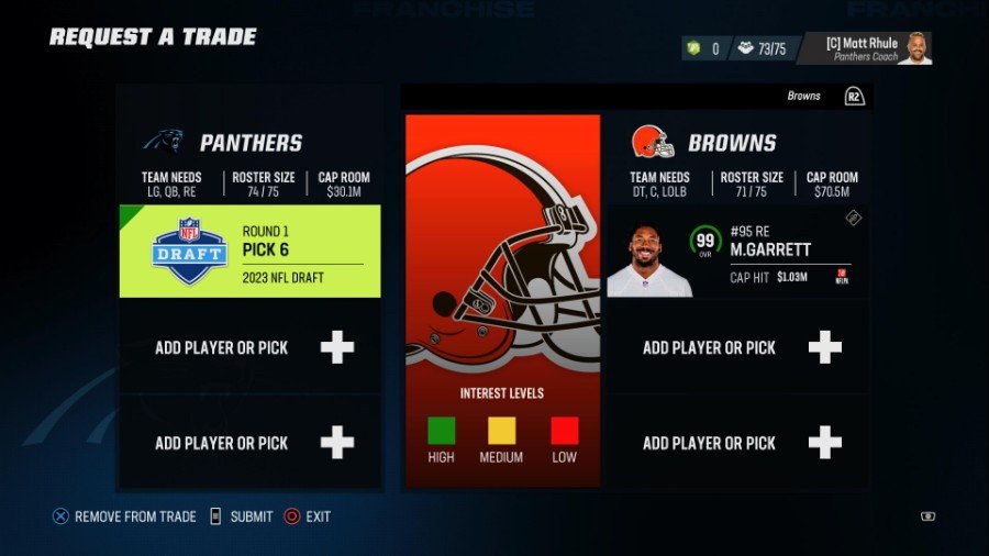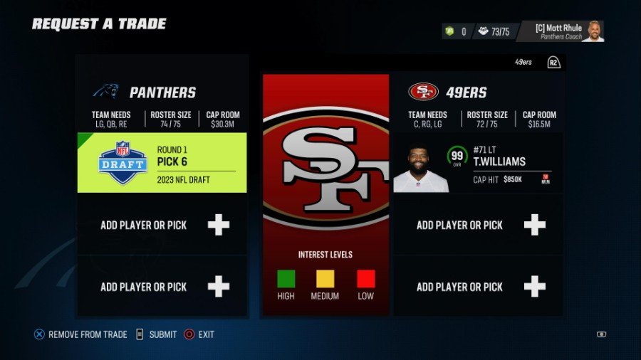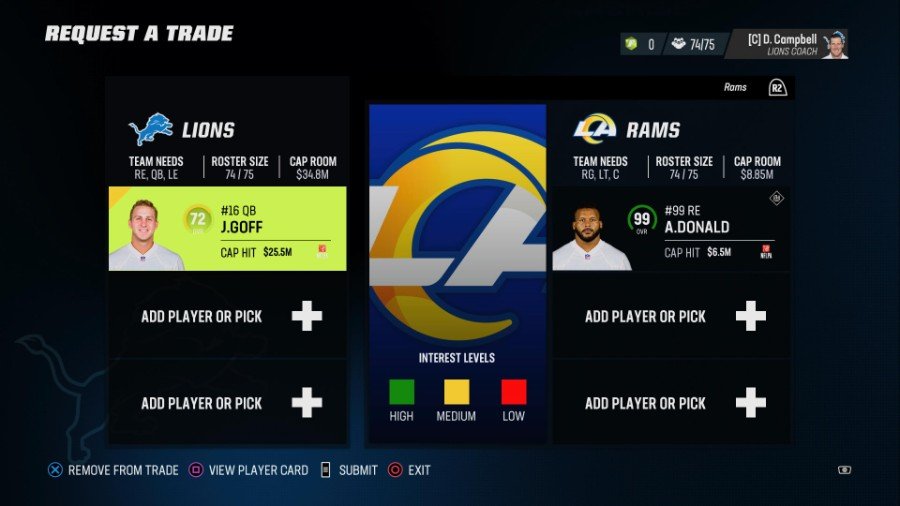 取引を提供するときは、 キャップルームとキャップヒットをチェック. クォーターバックの Jared Goff は、72 OVR で Walker よりも 10 ポイント高い評価を得ていますが、 2,500万を超えるキャップヒット ほとんどのオファーに対して彼の契約を吸収しすぎています。 いくつかの契約を自分で吸収するか、ドラフト ピックを提供する必要があります。