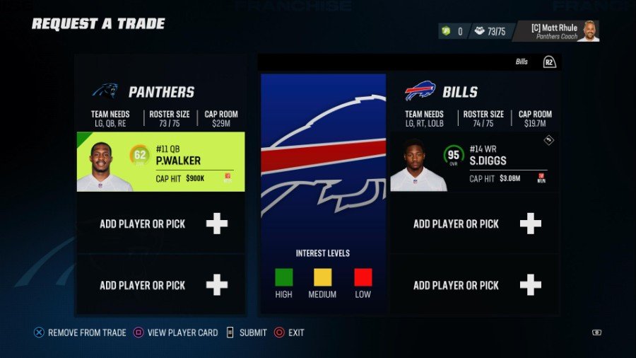 システムを操作する最善の方法は、クォーターバックを提供することです。 上記のように、一部のチームは突飛なトレードオファーを受け入れます。 カロライナとして、バッファロー レシーバーのステフォン ディグス (95 OVR) に PJ ウォーカー (62 OVR) を提供することは、バッファローがマッデン 23 で受け入れるトレードです。
