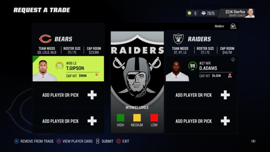 あなたはまだストレートアップトレードをしたいが、すでにクォーターバックとあなたの現在の最初のラウンダーをトレードしたとしましょう. システムを操作するもう 1 つの方法は、 チームのニーズに合った選手を提供する. 上記で、ラスベガスはディフェンシブ タックル、ライト タックル、レフト エンドが必要であることを示しました。 シカゴとして、左端の Trevis Gipson (75 OVR) が Adams に直接オファーされ、Raiders はそれを受け入れました。