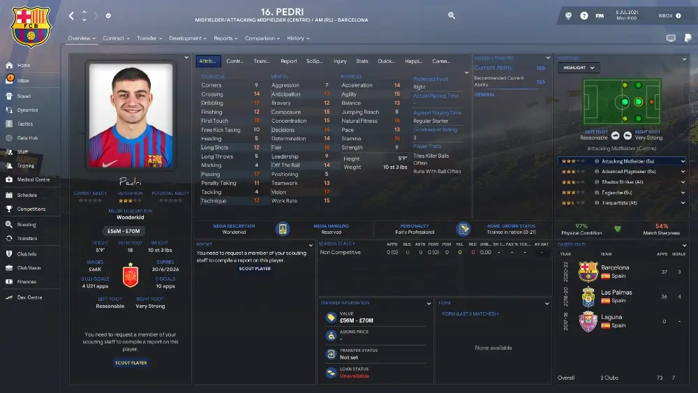現在の代表チームは、ロドリ、チアゴ、アセンシオなどを誇っています。 FM22 では、ティキタカの家から出現する最高の潜在能力 (PA) を持つワンダーキッズの一部を見ていきます。