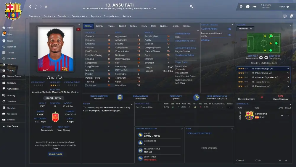 ファティは全面的にいくつかの素晴らしい属性を持っており、彼の 19 のフレア、16 のドリブル、16 のテクニック、13 のクロッシングは、彼を傑出したインバーテッド ウイングまたはインサイド フォワードにします。 彼は 15 のフィニッシングで射撃するときに非常に有能であり、14 のロングショットで遠距離からトラブルを引き起こすこともできます。 ファティは印象的な 16 のアクセラレーションと 16 のオフ ザ ボールを備えているため、ボールがなくても相手に問題を引き起こすスペースを見つけることができます。