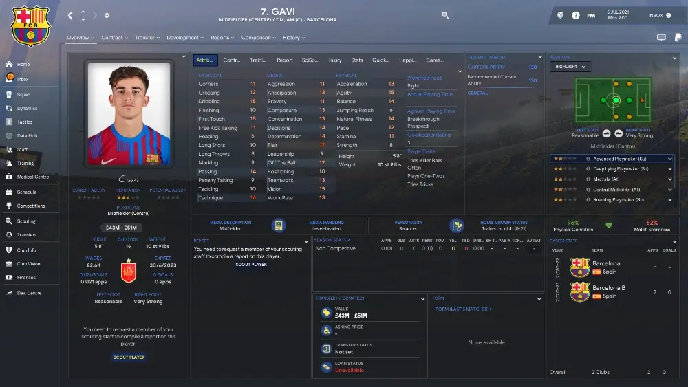 Gavi にはいくつかの素晴らしいスタッツがあり、最も顕著なのは彼の 17 フレア、16 テクニック、14 パスです。 これらのスタッツを組み合わせることで、自信を持ってボールを扱い、困難なパスを簡単に行うことができるプレイメーカーが生まれます。 才能ある若者は、15 のファーストタッチと 15 のドリブルも備えており、素晴らしいボール コントロールを実現しています。