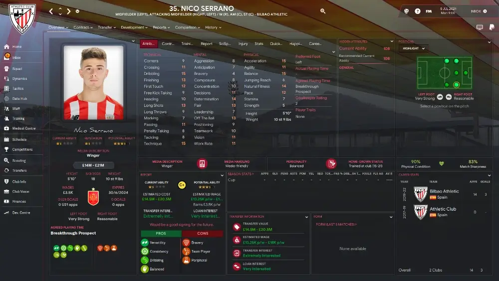 Athletic Bilbao の Nico Serrano の CA は 108 と低いですが、PA が 169 と非常に高く、これまでのリストの名前よりもはるかに安いという事実によって、ある程度相殺されています。