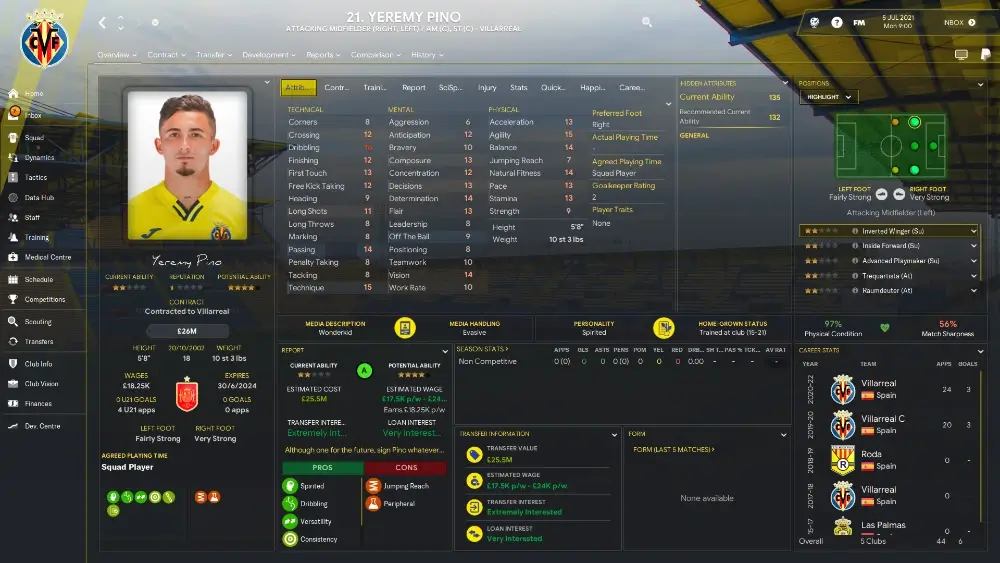 イェレミー ピノはスペインのビジャレアルでプレーし、わずか 18 歳ですでに 135 CA でプレーしており、168 PA に到達する途上にあります。