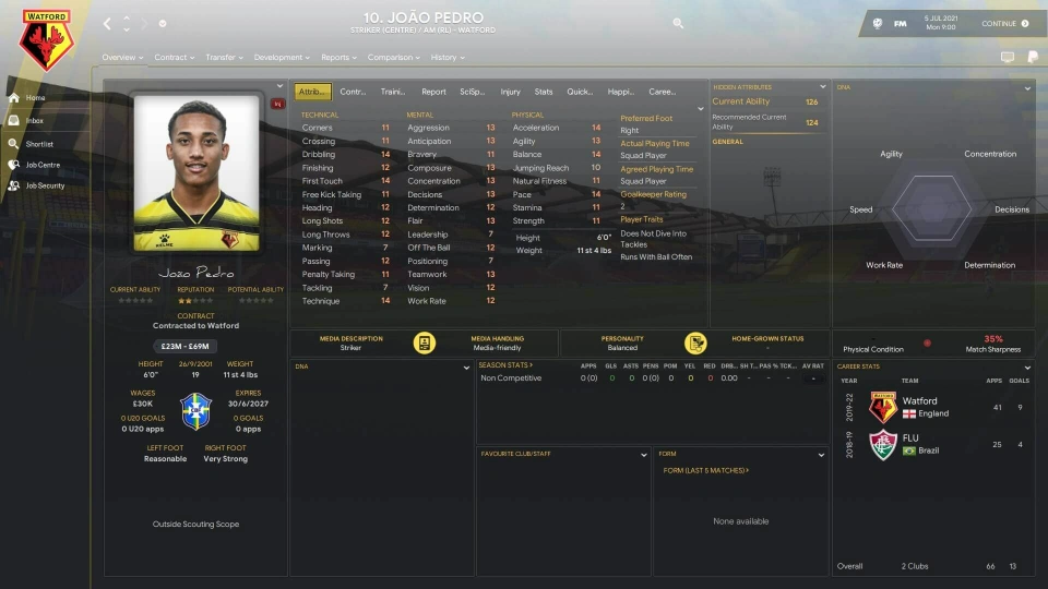 若いストライカーは、技術部門で 14 のドリブル、12 のヘディング、12 のロング ショット、および 12 のフィニッシュと、物理的な統計で 14 のアクセラレーションと 14 のペースでいくつかのまともな開始属性を持っています。 ボールを追いかけたり、プレスでディフェンダーにプレッシャーをかけたりするとき、彼は手ごわい高度なフォワードになる可能性が十分にありました.