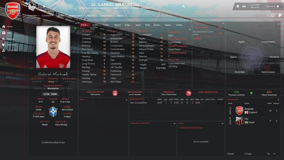 マルティネリは、アクセラレーション 16、ペース 16、アジリティ 15 という素晴らしい身体能力を備えており、追いつくには悪夢のような存在です。 彼の 16 のワーク レートは、これらのフィジカル スタッツと組み合わせると、ディフェンダーにプレッシングする際に優れた能力を発揮する可能性があります。 彼は多くのポジションでプレーすることができますが、彼の好みは左翼でプレーすることであり、強い右足でプレーすることは、逆ウィンガーまたはインサイドフォワードとしてプレーするのに適しています.