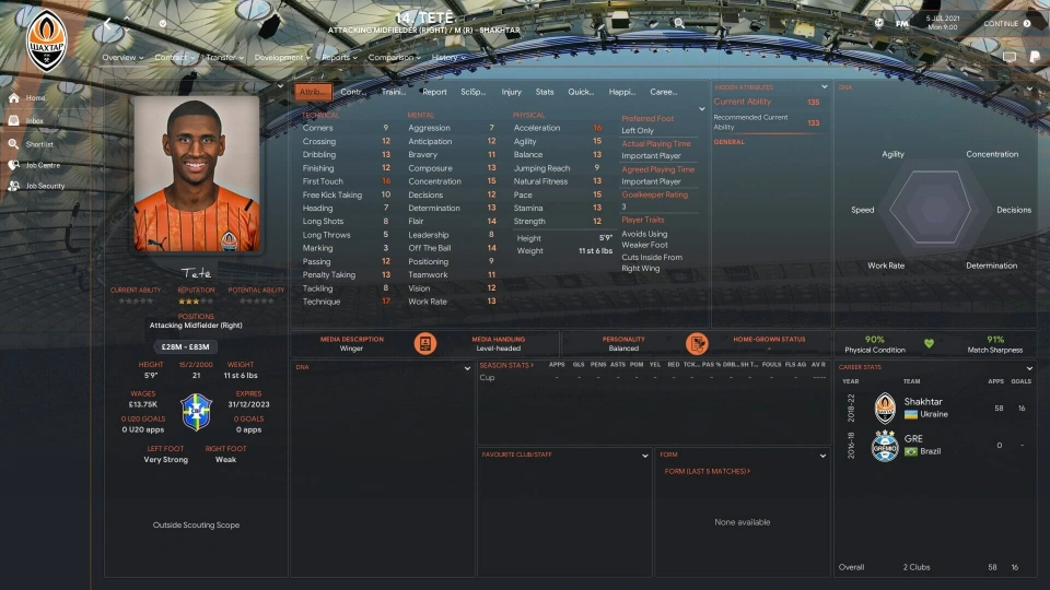 若くて才能のあるウィンガーは、17 テクニックや 16 ファースト タッチなど、いくつかの優れた技術的属性に恵まれており、ボールを足元に置いて素晴らしいパフォーマンスを発揮します。 彼はまた、16 のアクセラレーションと 15 のペースで翼にスピードを提供します。 右ウイングからインサイドにカットするのが好きな彼の選手特性は、特に彼が左足で強いことを考えると、彼をインバーテッド ウイングまたはインサイド フォワードとして理想的な候補にします。