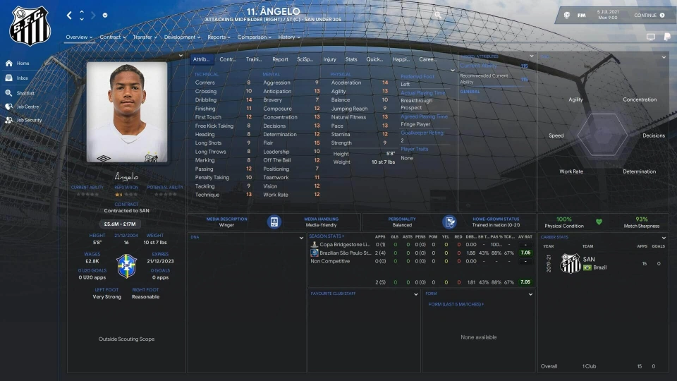身長 5’8 インチの若きウィンガーは、サントス アカデミーで育ち、最初のチームで 29 試合に出場し、1 得点と 3 ゴールを記録しました。 アンジェロは U16 ブラジル代表として 6 回出場しました。