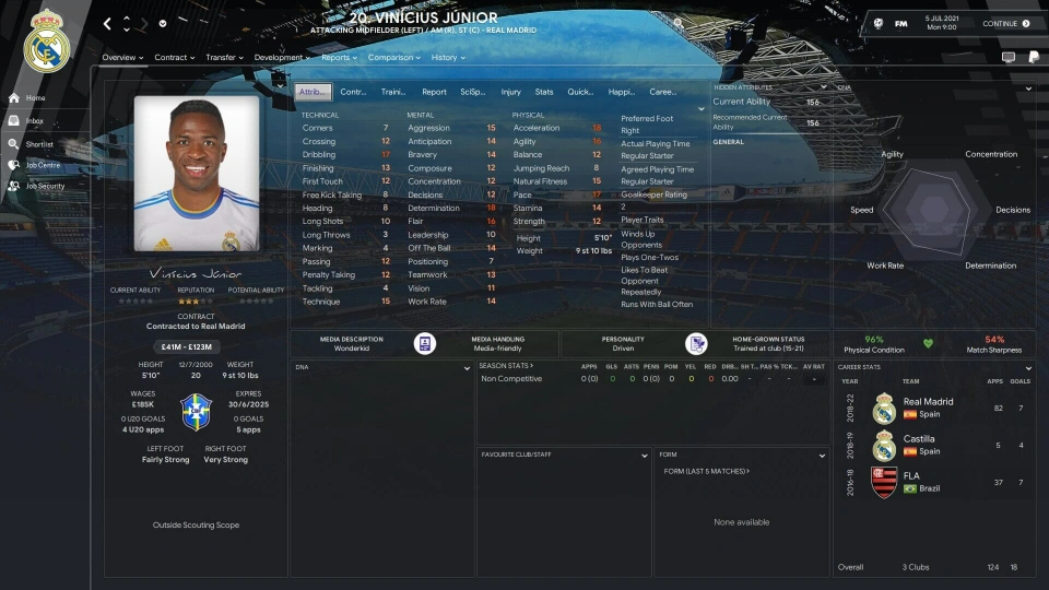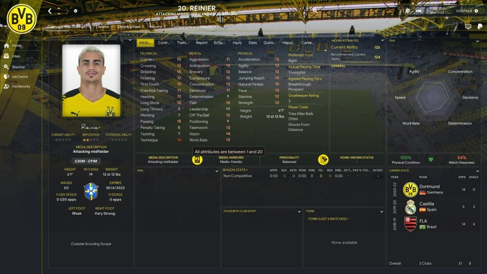 レイニエは、ブンデスリーガのボルシア・ドルトムントにローンで FM22 を開始します。 彼は2700万ポンドの手数料でフラメンゴから親クラブのレアル・マドリードに到着しました。 この若者は、全国レベルで U16、U17、U23 でプレーしましたが、まだ全国のトップチームに進出していません。 レイニエは昨シーズン、ドルトムントで全大会に20回出場し、レンタル期間が終了してレアル・マドリーに戻った。