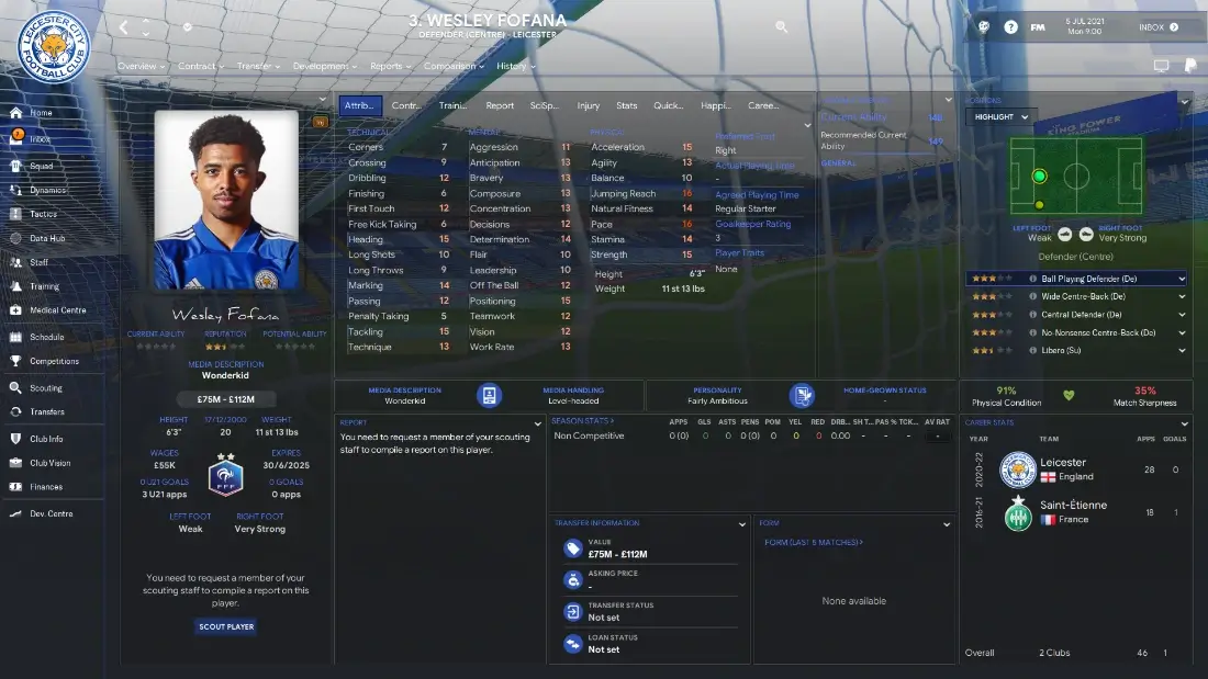FM22 で最高の若いフランス人プレーヤーである Wesley Fofana から始めましょう。 20 歳のレスター シティのセンターバックは、今夏、このフランス人選手との契約に非常に関心を持っているチェルシーの同類にとって、ホットな資産であることが証明されています。