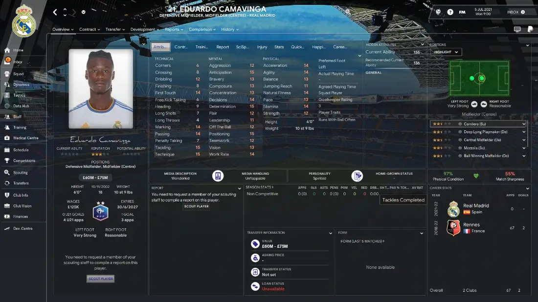 評価の高いミッドフィールダー、エドゥアルド カマヴィンガは、チャンピオンズ リーグで優勝したレアル マドリードの一員です。 Camavinga は素晴らしい PA を持っており、適切な育成により、彼の 136 CA はすぐに急上昇します。