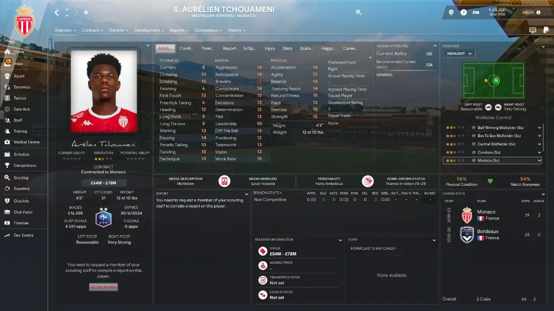 予算があれば、ASモナコのオーレリアン・チュアメニは素晴らしい獲得になるだろう。 彼の 135 CA は 164 PA に比較的近く、彼の統計はすでに印象的です。