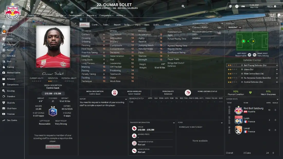 3 人目のフランス人選手は、現在オーストリアの RB ザルツブルクでプレーしているウマル ソレットです。 彼の手頃な価格、166 PA、および 130 CA は、彼をどのチームにとっても魅力的な追加にします。