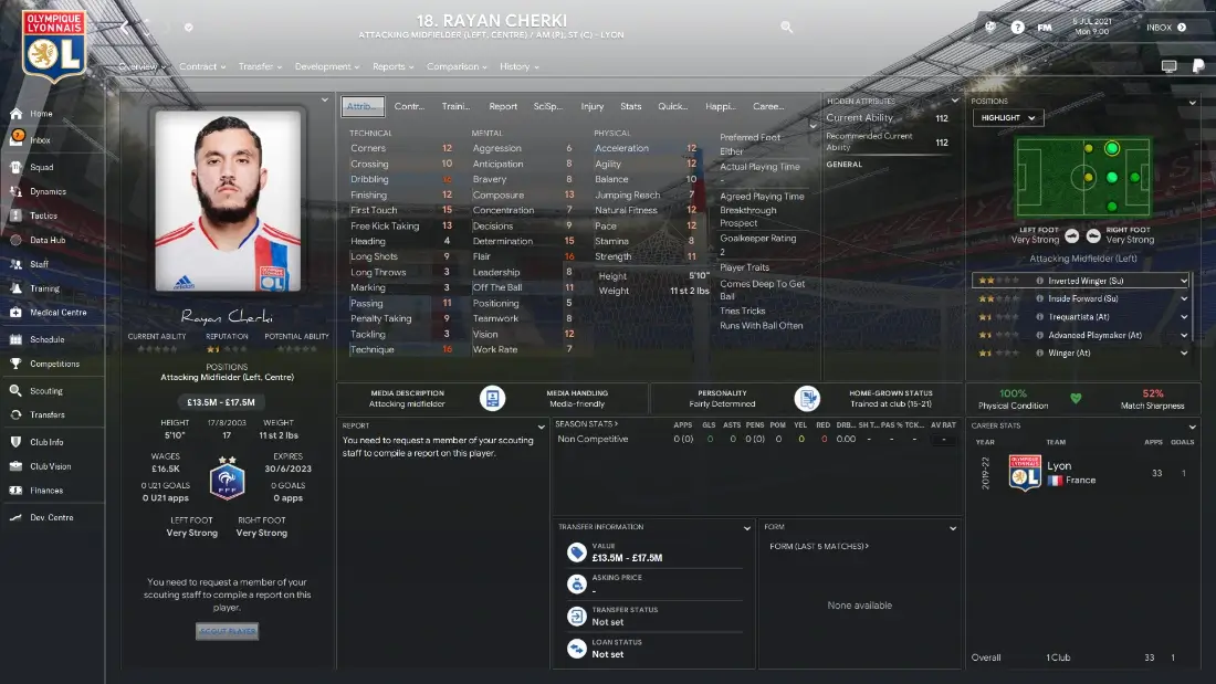 チェルキには、彼の若い年齢の誰かにふさわしい属性がいくつかあります. 16 のドリブル、16 のテクニック、16 のフレアを備えた彼は、スタイルを持って対戦相手をすり抜けたり、トリックしたりできるはずです。 若いリヨンの男は、15 の決意も持っています。これは、正しく指導され、指導された場合に、彼が潜在能力を発揮するのに役立ちます。 彼は多才なプレーヤーで、多くのポジションで快適で、両足に自信があります。
