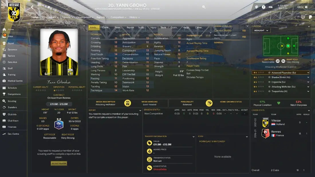 Fofana は非常に高い 175 PA の可能性を秘めており、すでに印象的な 148 CA でプレーしています。 彼は、技術的、精神的、身体的なカテゴリー全体でいくつかの素晴らしい属性を持っています。 20 歳の彼は、16 のジャンピング リーチと 15 のヘディングで優れた空中能力を持っており、身長が 6’3 インチであることを考えると、彼はほとんどの空中決闘に勝っていると言っても過言ではありません。 これはピッチの両端で有益であることが証明され、コーナーポストの近くでのルーティンにより、彼はかなりの量のゴールを獲得することができます。 彼はまた、16 ペースと 15 ポジショニングを持っているため、迫り来る脅威に対処するために適切なエリアにいる間、最もペースの速いストライカーについていくことができる可能性があります。 彼の 13 の予想も非常に優れており、対戦相手の次の動きを予測するのに役立ちます。また、15 のタックリングで、Fofana はほとんどの挑戦にも勝っています。
