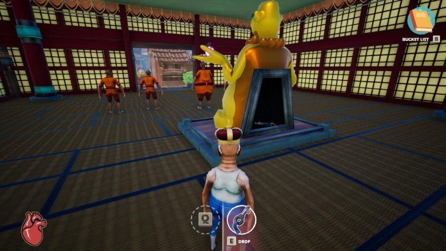 歩き回ってタスクや仕事を実行する人々の完全なコミュニティがあります。 それらのほとんどは平和ですが、あなたが近くに来ると激怒するいくつかのキャラクターがいます。 あなたは走ることができますが、彼らはおそらくあなたをひどく傷つけたり殺したりします。 彼らの攻撃を避けたいのなら、前庭のゴングの近くにいる女性の僧侶から手に入れることができる禅師の帽子が必要です。