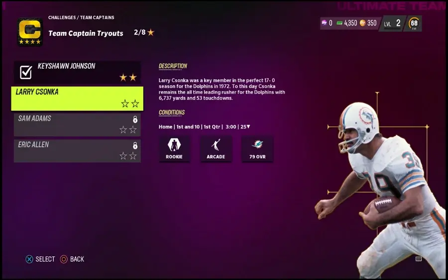 ラリー ソンカは、1972 年のマイアミ ドルフィンズの 17 勝 0 敗という完璧なシーズンに欠かせない存在でした。このフルバックは、146 試合に出場し、8,081 ヤードと 64 タッチダウンを記録し、1 試合あたり平均 55.3 ラッシュ ヤードを記録しました。