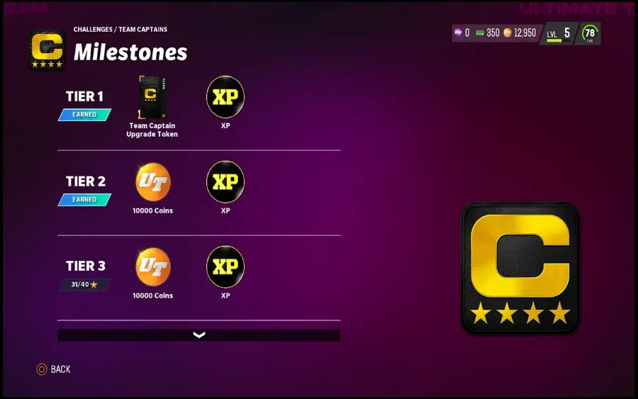 すべてのチーム キャプテンは総合レーティング 85 から開始します。アップグレードにはトレーニング ポイントとアップグレード トークンが必要です。 チーム キャプテン チャレンジを完了し、Tier 4 に到達すると、アップグレード トークンを 2 つ獲得できます。 すべてのチーム キャプテンは、99 OVR レーティングで最大になります。 名簿のニーズの変化に応じて、チーム キャプテンを切り替えることもできます。 現在のチーム キャプテンからアップグレード トークンを削除し、チーム キャプテン エクスチェンジを使用してチーム キャプテン ファンタジー パックを受け取り、他の 4 人の利用可能なプレイヤーの 1 人を選びます。